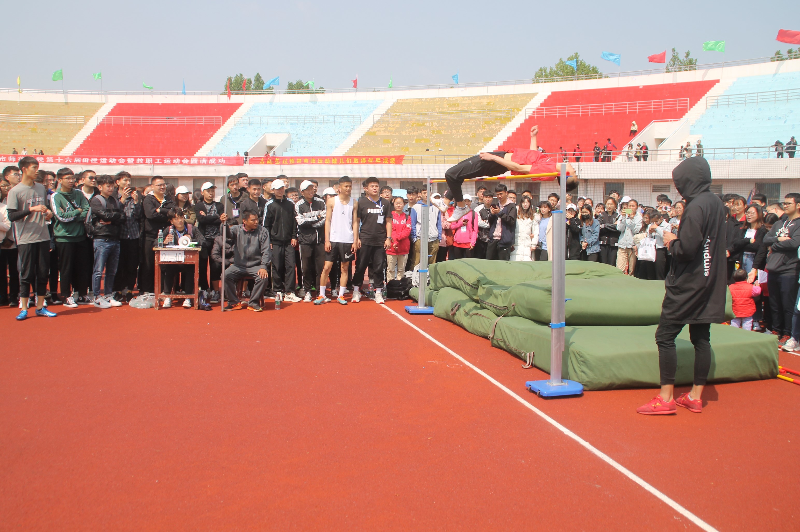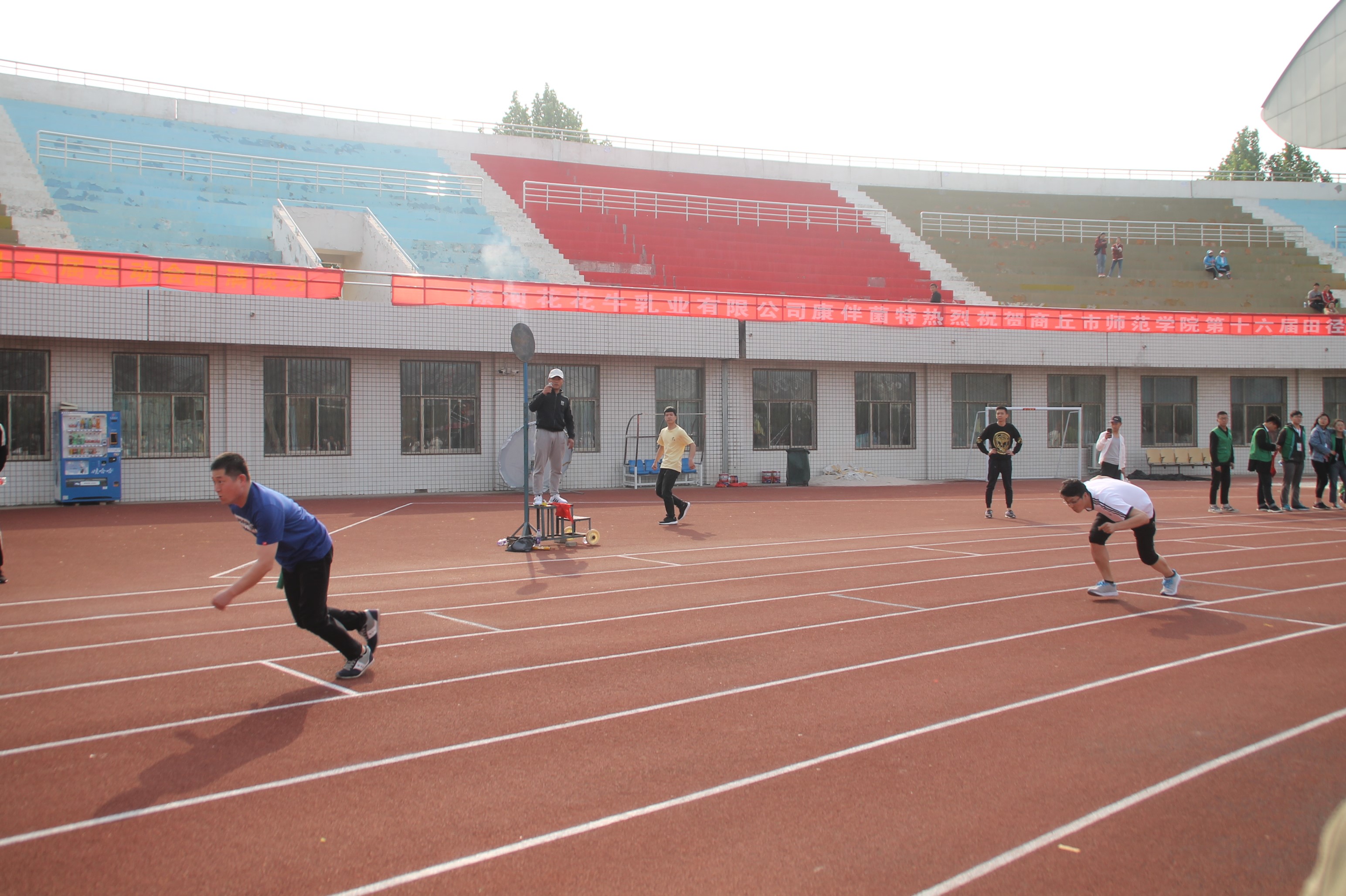 在这两天里,运动场上演了一幕幕精彩绝伦的竞赛大戏。大会宣布赛事开始,助跑预备、起跑枪声,挡不住的是健儿们如火一般的气势;舍我其谁、当仁不让,抹不去的是健儿们汗水浸透的誓言。赛场上选手们轻捷如燕,威猛如鹰,为挑战自我而奋斗,为集体荣誉而拼搏。赛场下观众们阵阵有力的助威,声声有劲的呐喊,欢呼声、加油声、摇旗声、擂鼓声,每一声助威都宣扬了商师学子前进的不懈追求,每一次呐喊都诠释了商师学子团结的忘我情怀。