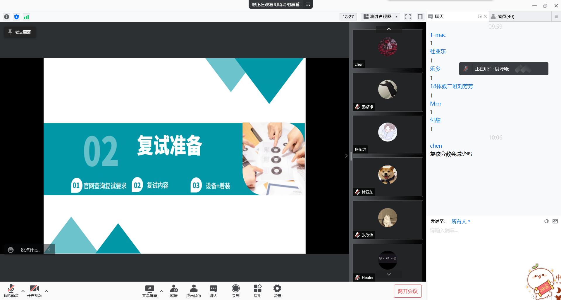 为更好帮助考研员工掌握复试及调剂的技巧与流程,有效提高录取率,伟德国际1949官网于2月23日在腾讯会议召开了2022届考研复试线上指导会。会议由18级辅导员戚瑞静主持。