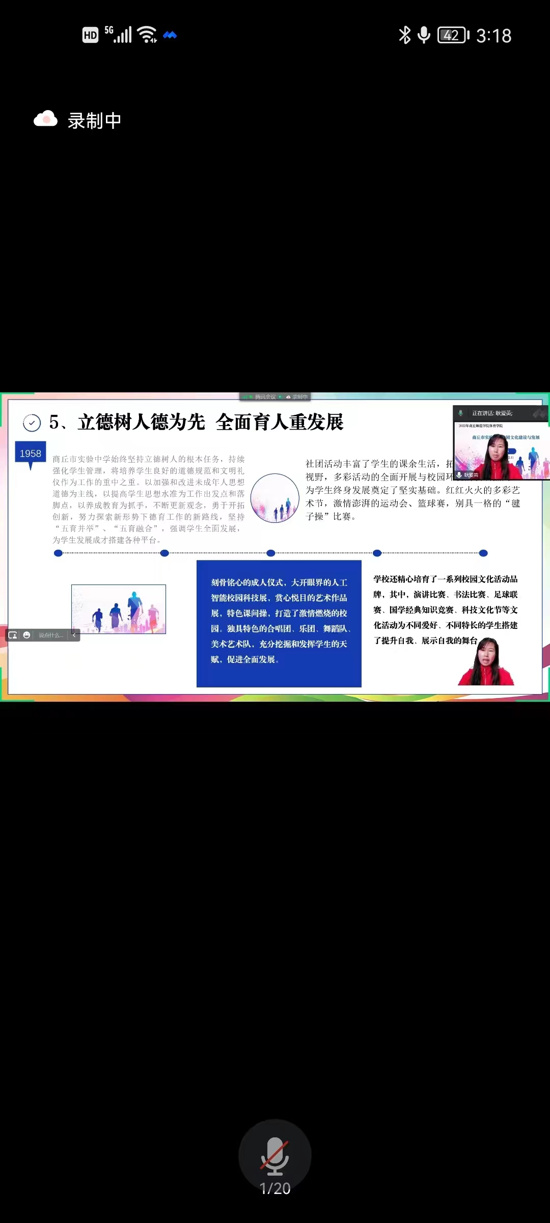 首先,耿爱英老师先用文字的形式介绍了公司简介、公司建设、文化建设、其次建校历史,地理位置等,让同学们对商丘市实验中学有了大致了解。从校风,校训,学风等方面进行了详细的讲解。耿老师以视频的方式向同学们展示了校园员工的跑操等视频,方便向同学们展示校园风采,并以照片的形式让同学们看到了实验中学所获得的成就。耿爱秋老师在会议结束之际,对同学们发出真挚的邀请,期待疫情过后,大家能够在商丘市实验中学的校园中见面,得到了同学们的一致认可。