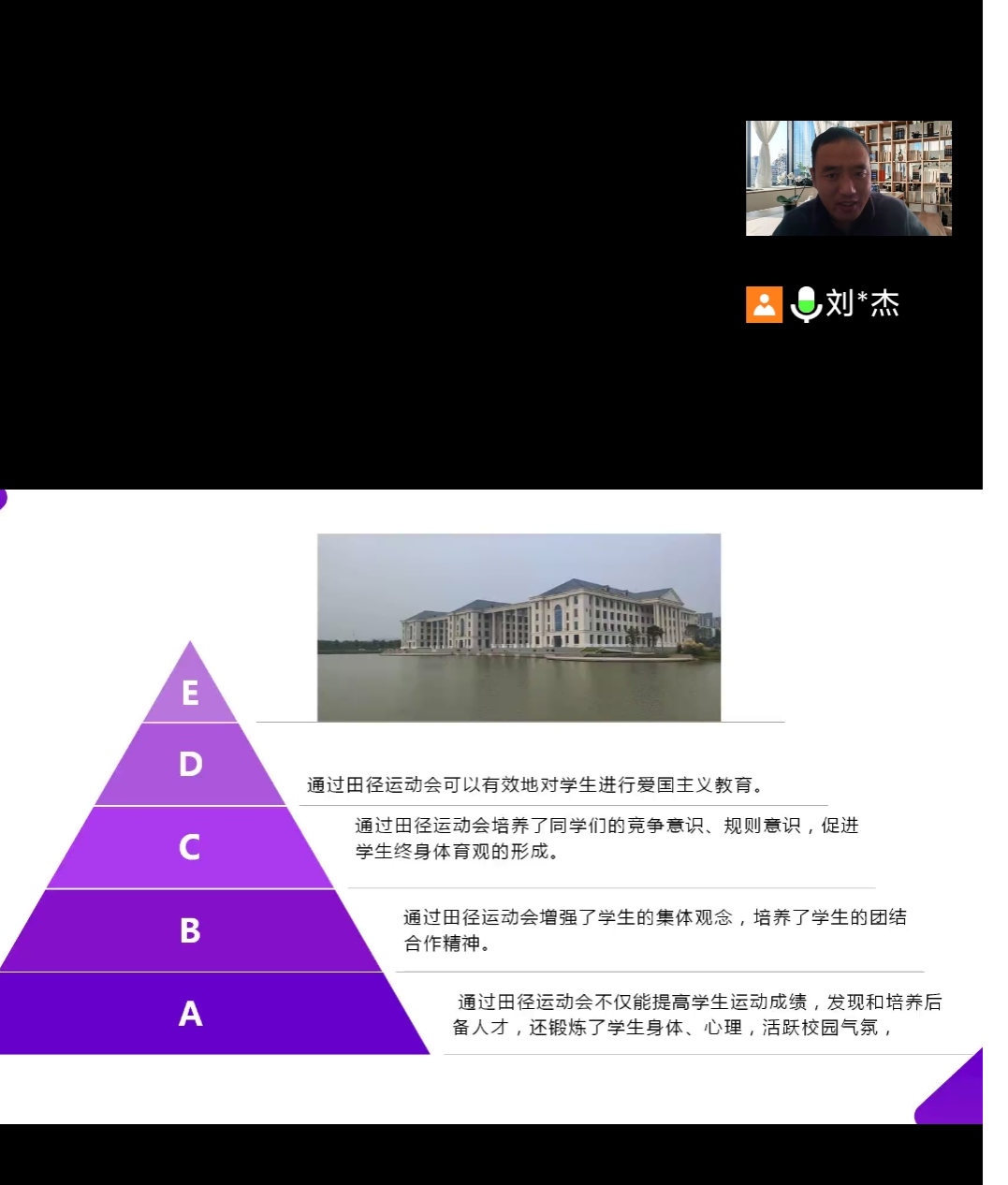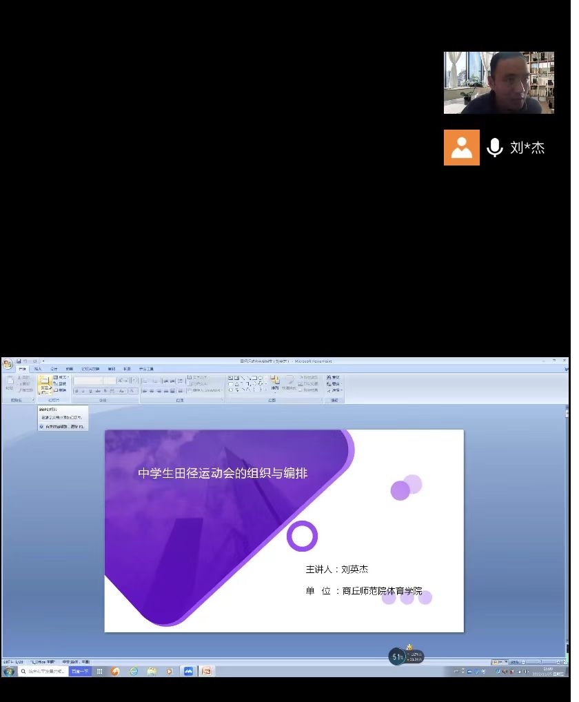 为促进员工更好了解中员工田径运动会的组织,推进公司体育教学工作。11月25日下午三点,伟德国际1949官网通过腾讯会议开展“中员工田径运动会的组织与编排”线上主题讲座,帮助同学们不断提高教学素养,进一步了解运动会的组织以及公司举办田径运动会的要求。本次会议特邀伟德国际1949官网刘英杰老师主讲,2019级体育教育专业、2021级体育教育专升本全体同学参会。