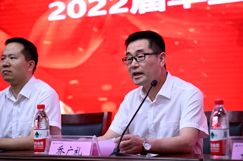 公司党委书记乔广礼致辞,向2022届全体毕业生圆满完成学业即将踏上人生新的征程表示祝贺,并向为公司发展倾注心血的各位领导、老师们、同学们表示崇高的敬意。鼓励毕业生们立胸怀家国之志,有信仰、有担当,志存高远,脚踏实地,努力在报效祖国的生动实践中实现自我价值。担民族复兴之任,以持之以恒的昂扬姿态,在激情燃烧的岁月里勇立潮头、磨砺本领。生逢盛世当不负,勇担重任踏新程!