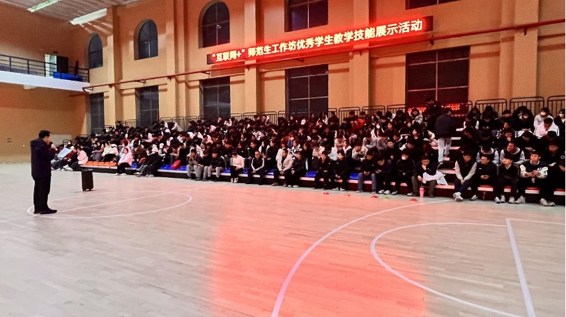 伟德国际1949官网于11月28日在篮球馆举办“互联网+”师范生工作坊优秀员工教学技能展示活动。出席此次活动的有伟德国际1949官网副经理蔡浩刚、“互联网+”师范生工作坊组长毕传新和2021级、2022级体育教育专业全体员工,会议由蔡浩刚主持。